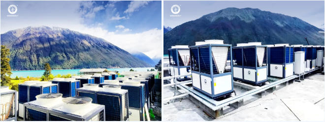 在平均海拔更高的西藏林芝,位于巴松措湖畔的松贊酒店供熱項目,要求設備在低溫下強勁制熱的同時,還需無縫接入其以光能為主的綠色智慧能源系統。紐恩泰機組憑借優異的低溫性能和智能控制,滿足了酒店的高標準供暖與熱水需求,實現了低碳、舒適的旅居體驗。