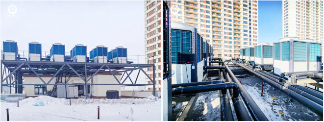山東省嘉祥縣梁寶寺43萬㎡社區項目則選用了144臺紐恩泰超低溫G60KD熱泵。該系列產品在嚴寒氣候下表現出色,制熱性能大幅提升,即使在-35℃的極端低溫下也能穩定運行。系統通過地暖與暖氣片末端為居民持續輸送溫暖,用戶滿意度高,印證了紐恩泰產品在大型社區集中供暖領域的成熟應用和可靠保障。